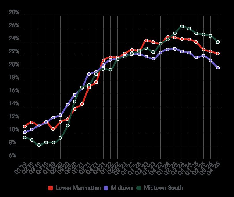 Lower Manhattan’s overall vacancy rate continued to improve, declining for the seventh consecutive quarter. The vacancy rate finished the year at 22.2%, down 2.1% from Q4 2024. The rate also fell by 0.3% over the previous quarter. Declining vacancy has been in lock step with the streak of positive net absorption. This suggests that office buildings that are converting to residential have also contributed to the continued improvement in vacancy rates, insofar as the converting office buildings generally have very high vacancy rates. This is also reflected in the market’s declining office inventory, where Q4 2025 saw the second largest year-overyear reduction in office square footage on record (nearly 3 million sq. ft. of office space left the market this year).