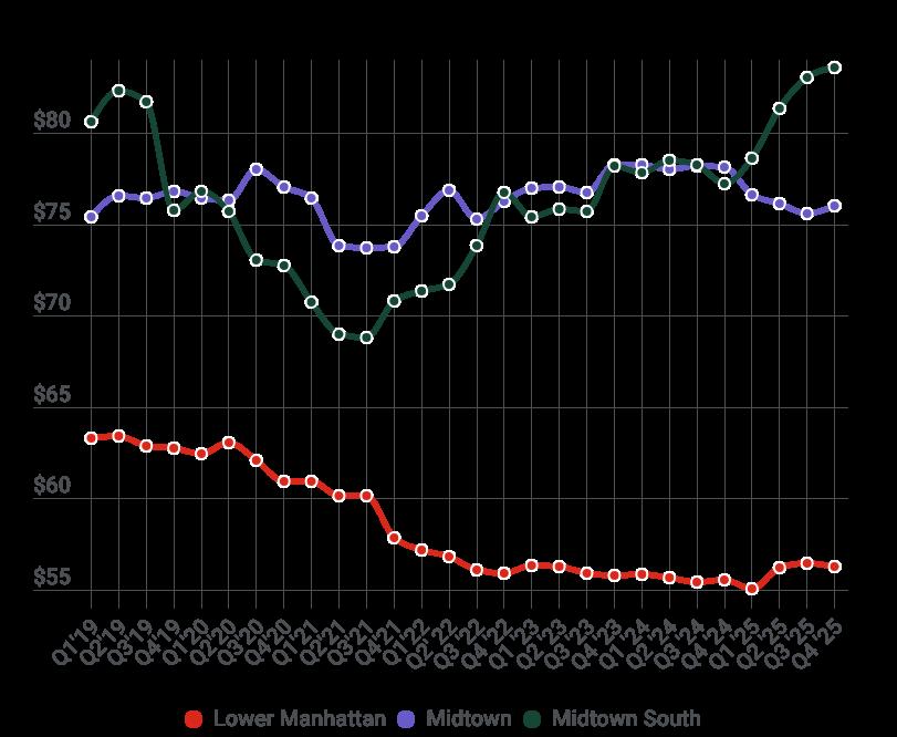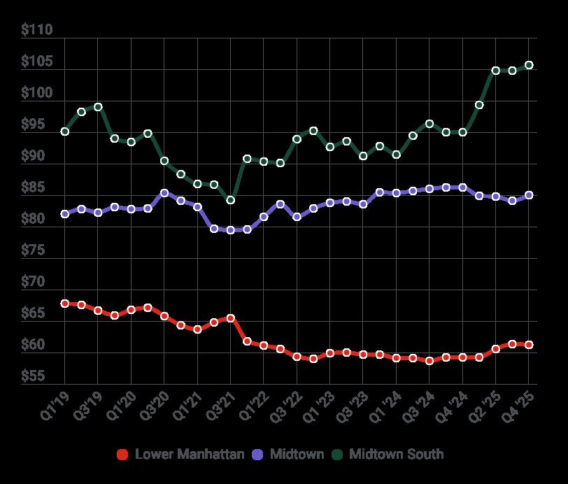 After a 2024 marked by modest improvement, Midtown asking rents dipped in 2025 and ended the year at $76.03 — down 2.7% over the year. Overall asking rents in Midtown South surged in 2025 and reached record levels in two out of the four quarters. The submarket ended the year at a record high of $83.58 in Q4. Class A rents trended similarly, eclipsing the rent record in three out of four quarters and ending Q4 at a record high of $105.64. Midtown South rent figures consistently surpassed Midtown rates by a wide margin throughout 2025.
