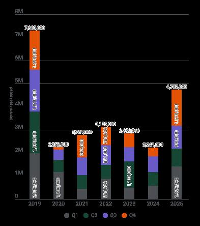 This past year of leasing has been dramatic given the depressed leasing totals following 2020. Four of the previous five years did not eclipse 3 million sq. ft. of activity; the district saw its lowest leasing total on record in 2024. 2025 delivered a pleasant surprise to the district — so much so that leasing has risen to pre-pandemic levels.
