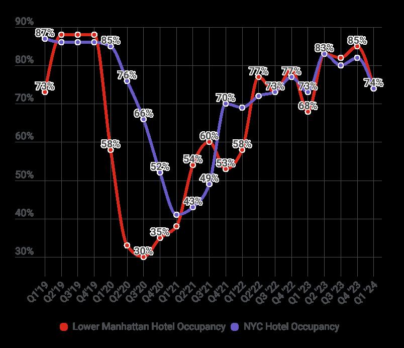 Lower Manhattan hotels also enjoyed the highest Q1 occupancy rate since 2008. At 74%, occupancy declined from Q4 as it always does, but outperformed Q1 2023 by 6%. City-wide occupancy did not perform as strongly as Lower Manhattan’s, remaining unchanged from last year’s Q1 and slightly dipping from Q4 2023.