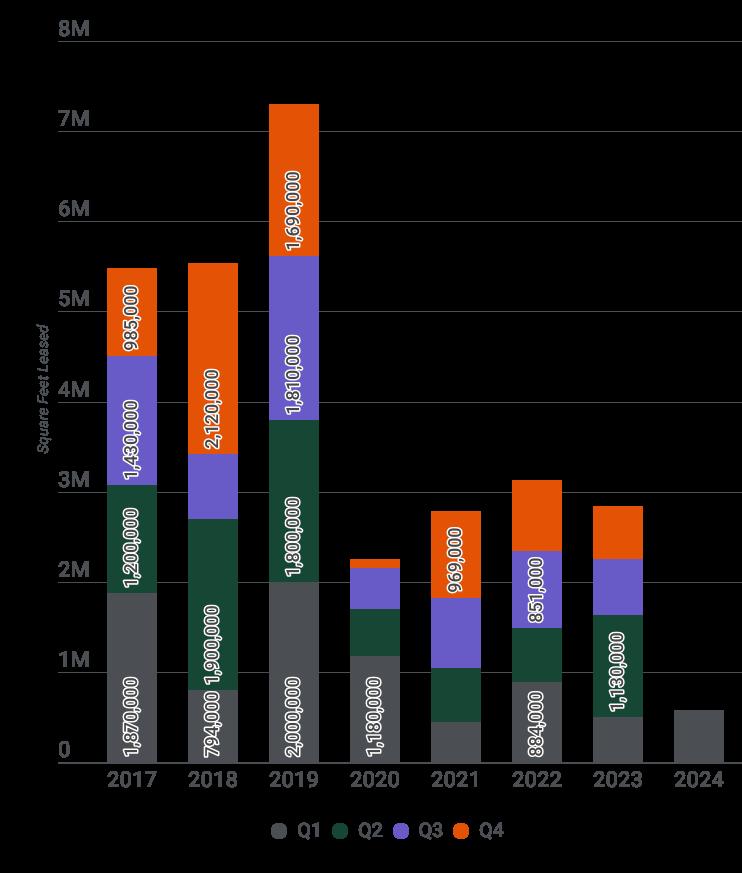 Lower Manhattan Annual New Leasing Activity, 2017-2024