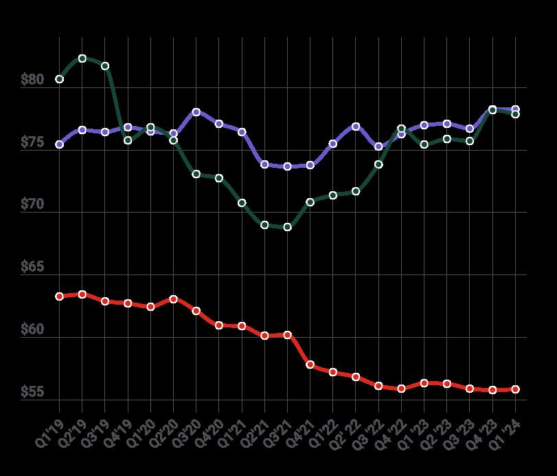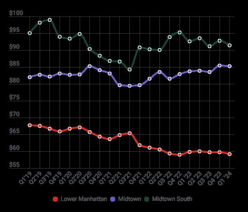 Along with Lower Manhattan, asking rents did not fluctuate much across the city in comparison to Q4 2023. Midtown rents were the same as they were last quarter, $78.23, while Midtown South rents fell by half a percentage point to $77.81.