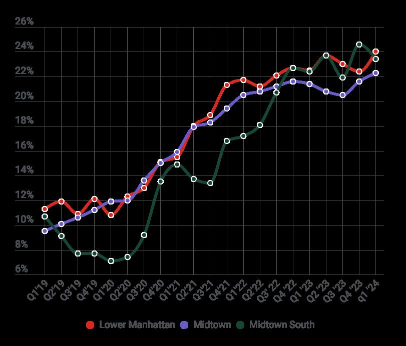 Lower Manhattan’s overall vacancy rate increased to a record high of 24.7% after moderating during the second half of 2023. Compared to Q1 2023, this was a 2.1% increase, the largest year-over-year rise among the three major submarkets. Midtown and Midtown South also saw their highest overall vacancy rates on record, 22.8% and 23.4%, respectively.
