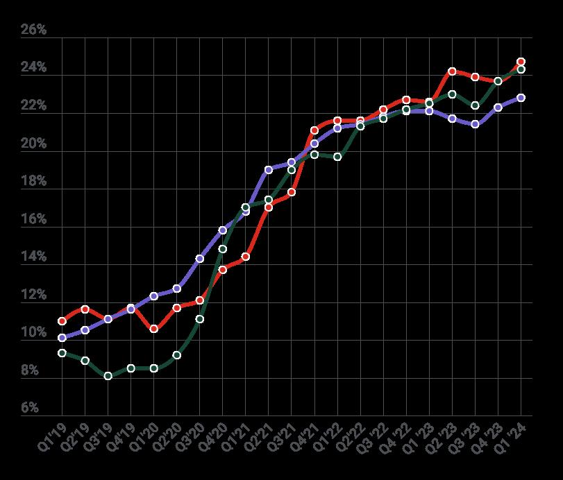 The technology sector led the leasing charge in Q1, taking up 31% of total space leased. Rippling, an IT, HR and finance workflows platform, had the second largest deal of the entire quarter, relocating from Midtown East and taking up 68,680 sq. ft. of space at 4 World Trade Center. Circle Internet Financial Limited, a peer-to-peer payments technology company, signed a 34,328 sq. ft. lease at 1 World Trade Center. CoreWeave, a specialized cloud provider delivering a massive scale of GPU-accelerated compute resources, signed a 17,421 sq. ft. lease at the top floor of 33 Whitehall St. and is relocating from a Brooklynbased WeWork.