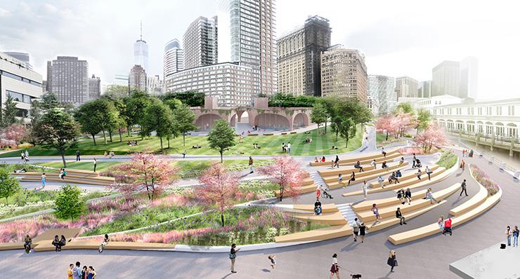 Work continues on parts of the Financial District and Seaport Climate Resilience Master Plan, a resilient infrastructure plan released in 2021 to protect Lower Manhattan from future flooding. The master plan is part of the larger Lower Manhattan Coastal Resiliency strategy, with active capital projects in Battery Park City, the Battery and Two Bridges. The plan calls for the creation of a twolevel waterfront park that extends the shoreline of the East River by up to 200 feet.