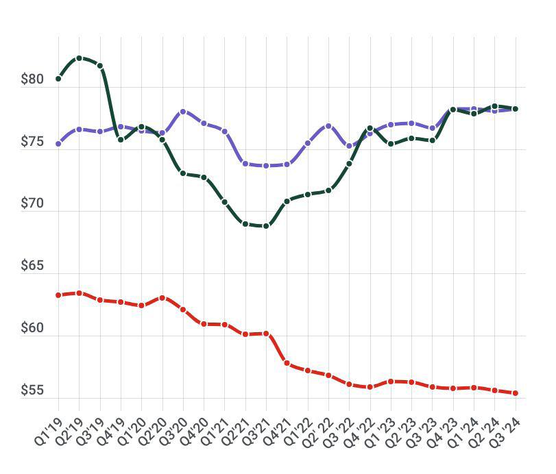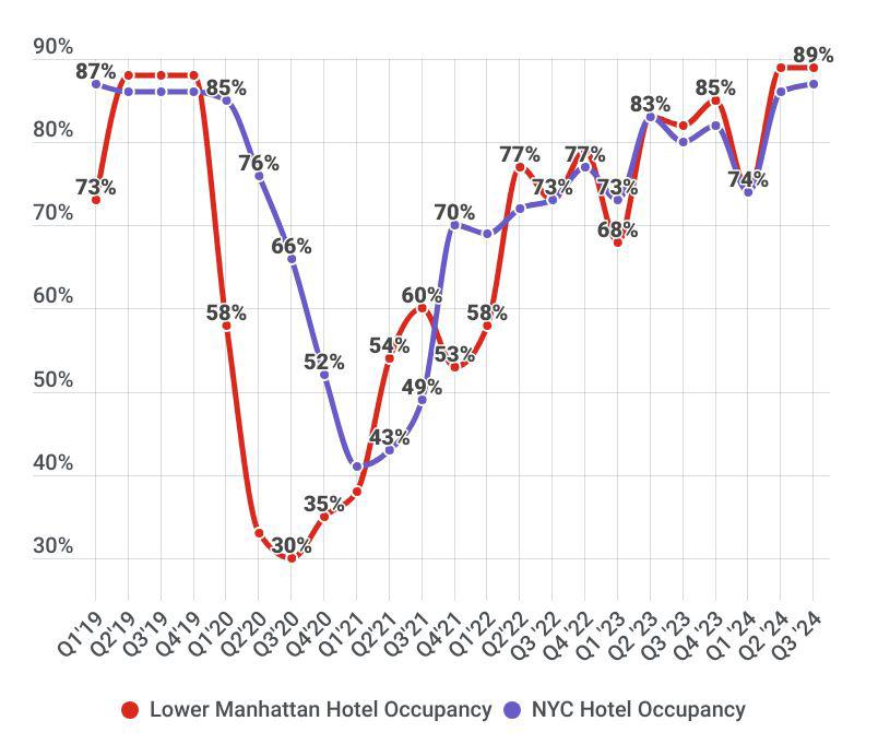 Lower Manhattan’s hospitality market posted an impressive 89% occupancy rate, unchanged from Q2. 2024’s Q3 rate also out-performed Q3 2023 by 7%, and gained a slight 1% edge over the pre-pandemic figure. Downtown’s back-toback quarters of record high occupancy suggest that one of the primary facets of post-pandemic recovery indicators, hotel room occupancy, has fully rebounded. Additionally, the broader NYC market reached a record 87% rooms occupied (tied with 2018 figures) — a testament to the city’s post-Covid progress within the hospitality and tourism industry.