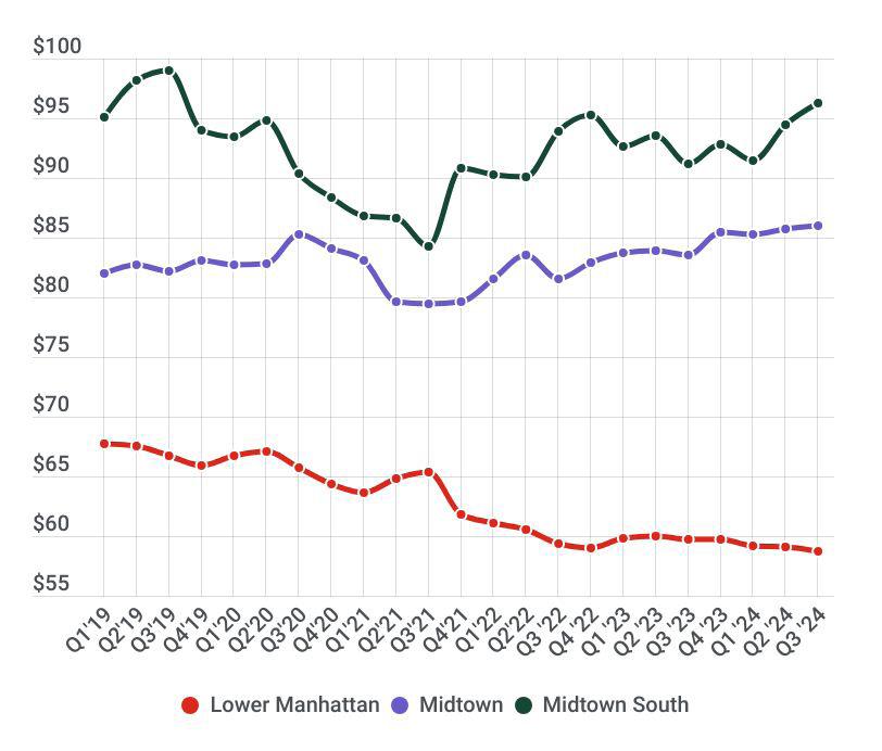 Overall asking rents in Midtown and Midtown South, on the other hand, have returned to pre-pandemic highs. Rents in Midtown and Midtown South increased by 2% and 3.4%, respectively, and currently hover at the $78 per sq. ft. mark in both submarkets. Additionally, these markets’ rent values have remained stable for the past year — a particularly unusual trend for Midtown South, which has experienced notable year over year volatility for the past decade. Class A office rents also increased over the quarter and year for the two submarkets, with the Midtown South value spiking up by 5.6% on an annual basis and 1.9% on a quarterly basis.