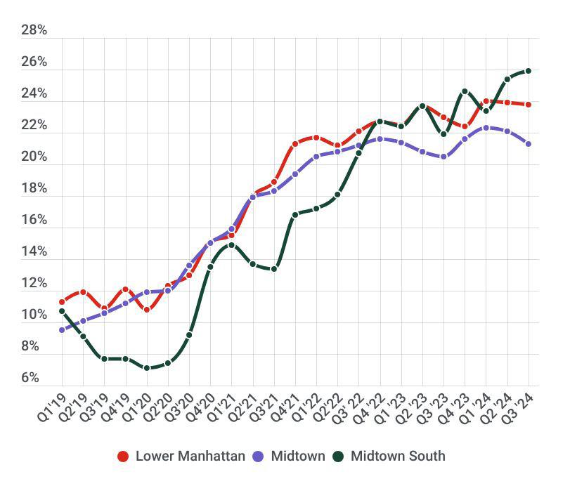 The Class A market paralleled the overall vacancy market in Q3, as the Lower Manhattan rate stayed relatively flat at 23.8% and Midtown South shot up to 25.9%, a Class A record. Midtown’s Class A rate fell by almost a full percentage point over the quarter, ending Q3 at 21.3%.