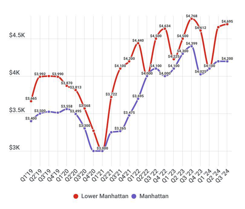 Lower Manhattan’s third quarter rent prices continued to rise, reaching a median rate of $4,695. This marks a 1% increase over the previous quarter and a 17% growth rate compared to pre pandemic figures. Rental price per sq. ft, which currently stands at $80.75, has risen over the quarter, year and compared with pre pandemic figures as well. Furthermore, the district’s median rent surpassed the citywide rent value of $4,200 per month.