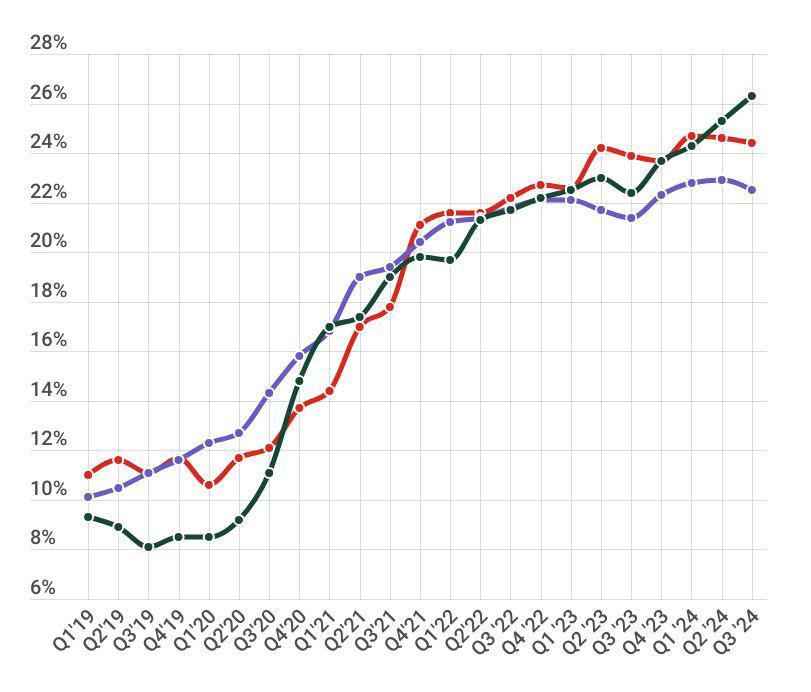 Lower Manhattan’s overall vacancy rate declined modestly for the second straight quarter, finishing Q3 at 24.4%. Midtown South has surpassed downtown as the highest vacancy district, and broke the central business district (CBD) record for the second straight quarter — posting a rate of 26.3%. The Midtown South market also experienced a dramatic year over year change of 3.9%. Meanwhile, Midtown rates have fared the best over the past two years, and finished Q3 with a 22.3% vacancy rate, down very slightly from Q2.
