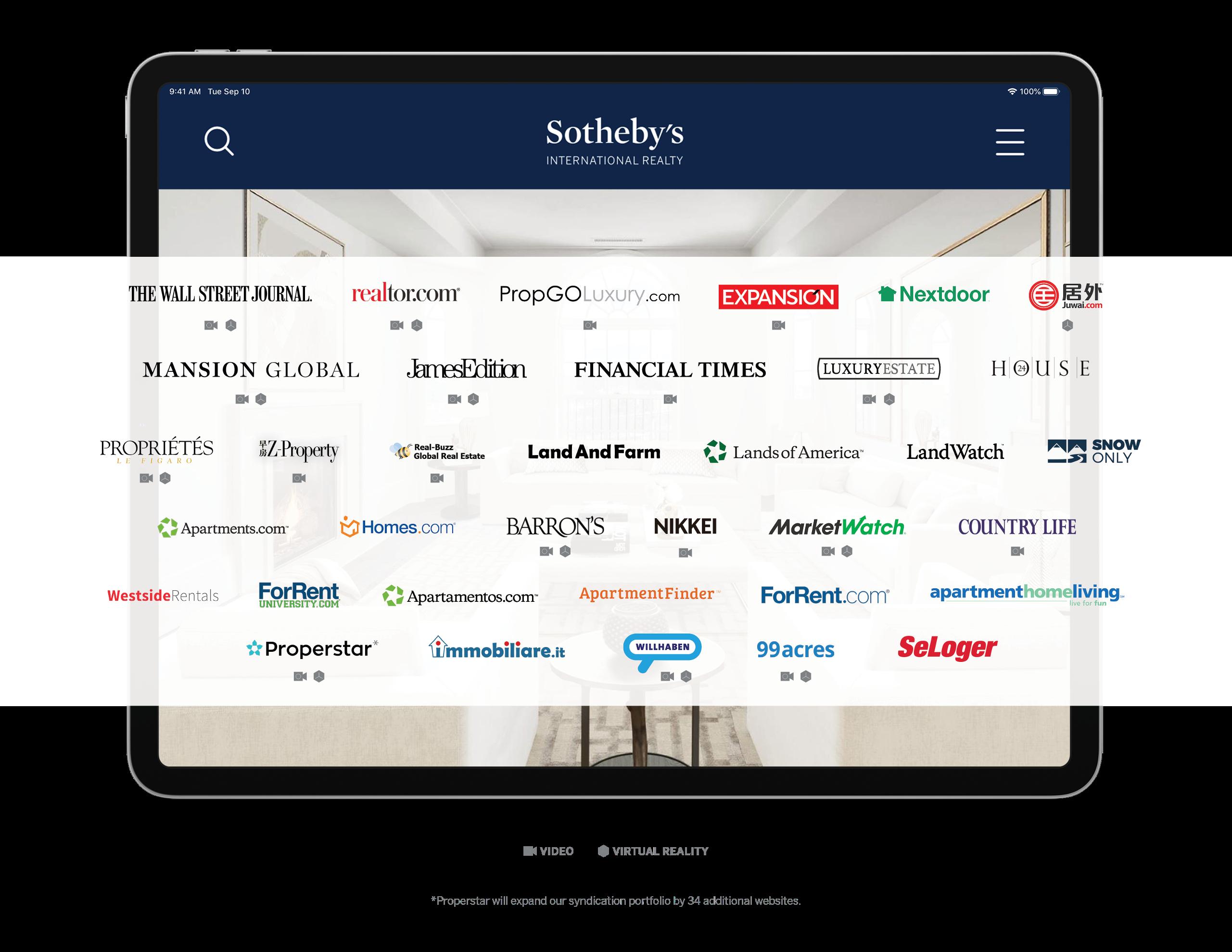 The exposure and worldwide reach of our listings is a crucial piece of what sets us apart from the rest of the industry.Our global media partners include the most authoritative news,lifestyle,and financial voices,as well as real estate-centric websites. Once a home is showcased on sot hebysrealt y.com, it is exclusively dist ribut ed t o more t han 10 0 Sot heby?s Int ernat ional Realt y affiliat e websit es around t he world.