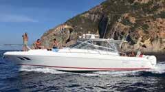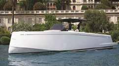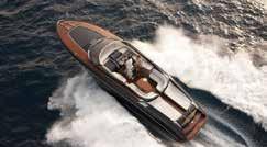Below deck, the ambiance features leather upholstery with an aquamarine and white color scheme that matches the ceiling. Riva Anniversario is fitted with an electronically controlled two-speed gearbox that unleashes all the power of the two YANMAR 8 LV engines, each rated 370 hp. This engine configuration delivers a top speed of 40.5 knots and provides a range of 155 miles at a cruising speed of 36 knots.