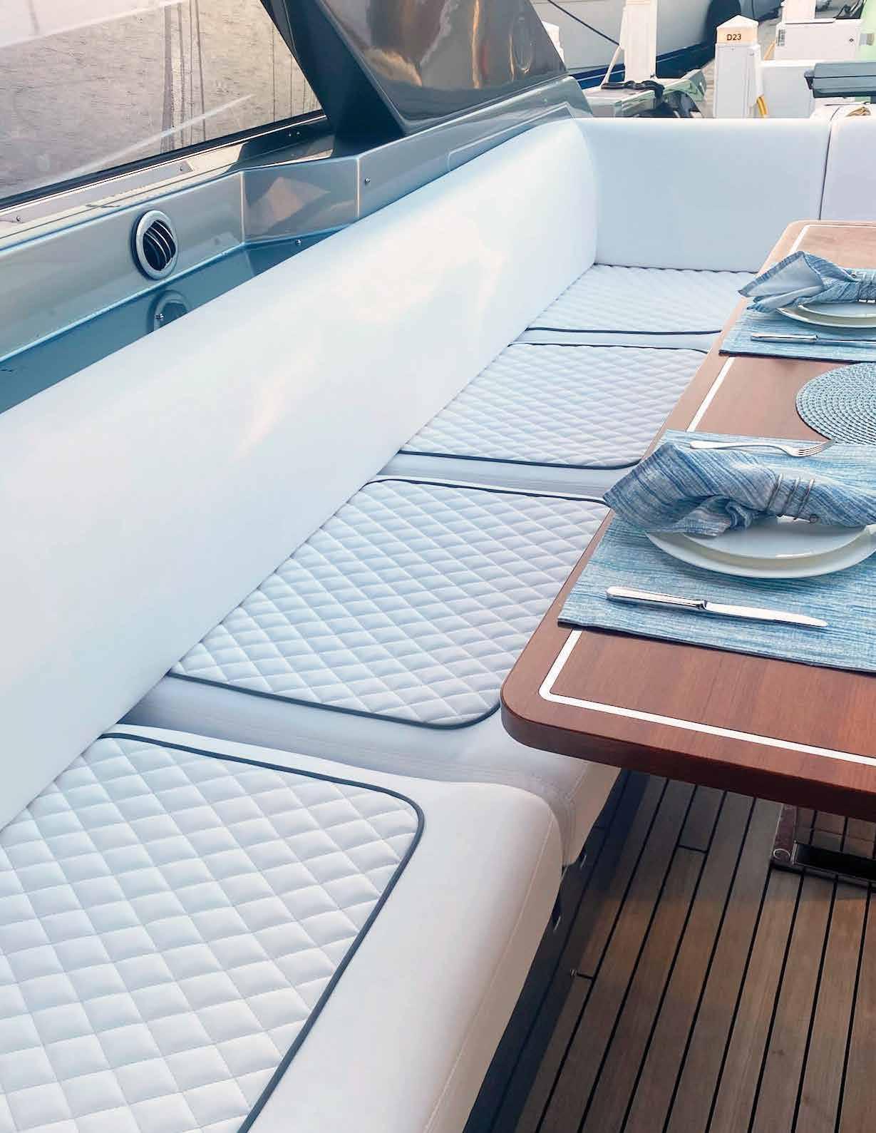 The entire aft section on board is occupied by the engine compartment hidden below the classic sun pad, which is upholstered with innovative outdoor leather in alternating aquamarine and white colors.