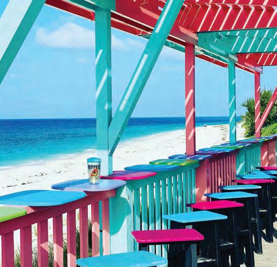 Exumian food is a mouth-watering fusion of fresh seafood and traditional Bahamian dishes. Visitors will have an array of quality options at their disposal; a good bet is to ask a local what their go-to spot is! One tried-and-true favorite is the string of colorful beachfront cottages known as The Fish Fry on Great Exuma, which are known for their barbeque and made-to-order fish fry. They’re a late-night staple, especially on weekends when the music amps up and everyone starts to mingle. On Little Exuma, the ambient, open-air grill Santanna’s (below) is just steps from Tropic of Cancer Beach, and serves authentic seafood dishes topped with some of the tastiest sauces on the islands. And for table-made conch salad, fire-roasted conch burgers, or to experience a Bahamian Sunday pig roast, head to the Chat ‘N’ Chill beach bar (left) on Stocking Island, a legendary spot that attracts an animated mix of yachters and locals. Don’t be surprised if you end up dancing next to a beach bonfire. Be sure to put your feet in white-sand beach at Nipper's Beach Bar & Grill on Great Guana Cay. Swim by the third-largest coral reef in the world or grab a "Chicken in Da Bag".