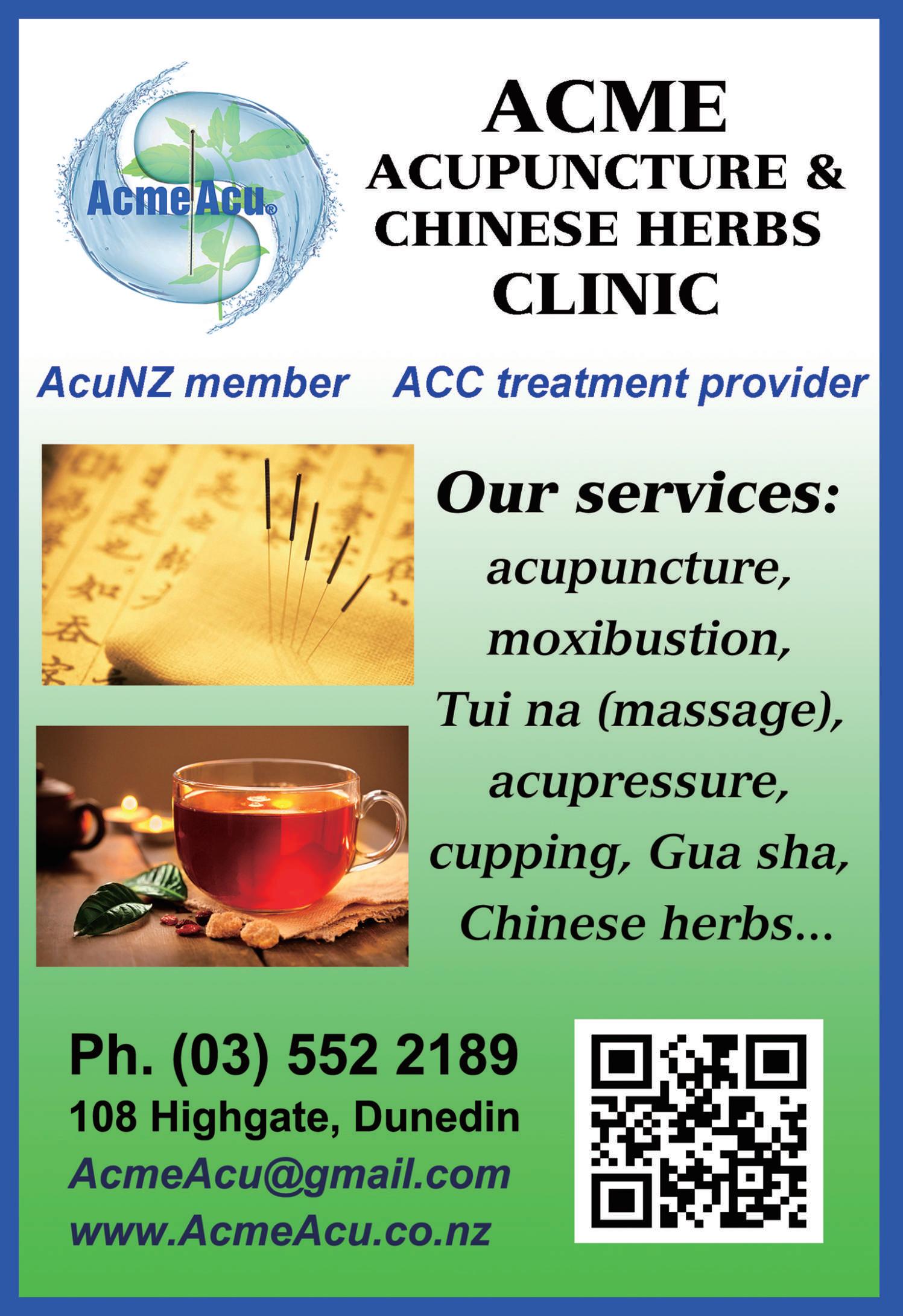 AcmeAcupunctureandChineseHerbs Clinic(Acme Acu)isanAcupuncture NZ(formerlyNZRA)member andACC treatmentprovider, foundedbyHong Wangin2013inDunedin.