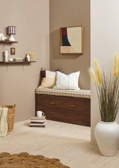 4. Warmth is the key word for neutrals in 2024, with layers of deeper shades and the revival of all things brown. The back and left wall are painted in Resene Jetsam Brown with front right wall in Resene Sandspit Brown. The shelves and bench seat are stained in Resene Colorwood Bark with floor stained in Resene Colorwood Breathe Easy. Side table, candle holder and bud vase in Resene Albescent White, large vase in Resene Warmed Brown, lamp base in Resene Scoria and books on floor in Resene Jetsam Brown, Resene Albescent White and Resene Warmed Brown. Cushions and throw from Baya, art from A+C Homestore. (Project by Melle van Sambeek, image by Bryce Carleton)