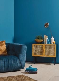2. Deeper azure ocean blues paired with caramel and darker timber tones, lend a beachy-theme palette a warmer autumnal feel. These walls are painted in Resene Undercurrent with skirting in Resene Tarawera. The floor is finished in Resene Colorwood Breathe Easy. On the sideboard the vase is Resene Half Sandcastle, bird in Resene Pirate Gold and bookend in Resene Blumine. The book on the floor is painted in Resene Calypso with small pot in Resene Juniper. Mat from nestdirect.com, chair from Danske Møbler, cabinet from Mocka. (Project by Moneuan Ryan, image by Bryce Carleton)