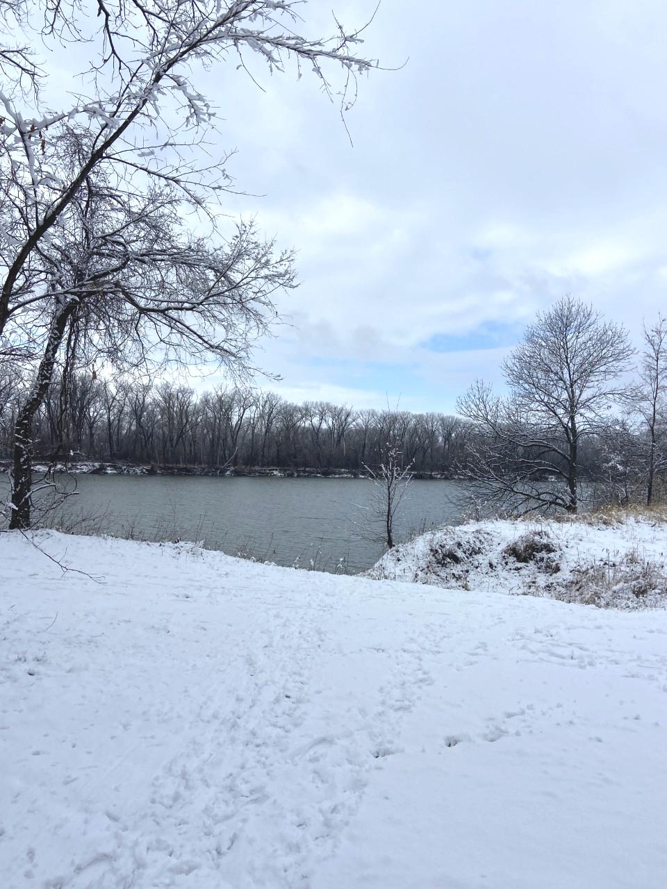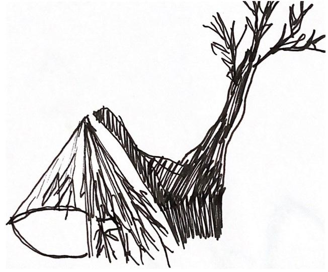 Riverfront Park is located along the Kaw River, just north of I-70. After spending several hours observing, sketching, photographing, and experiencing, we each chose our own site for which we would construct our pavillion. The site I chose centers around a large tree that has been struck by lightning and stands alone among dense, wooded areas