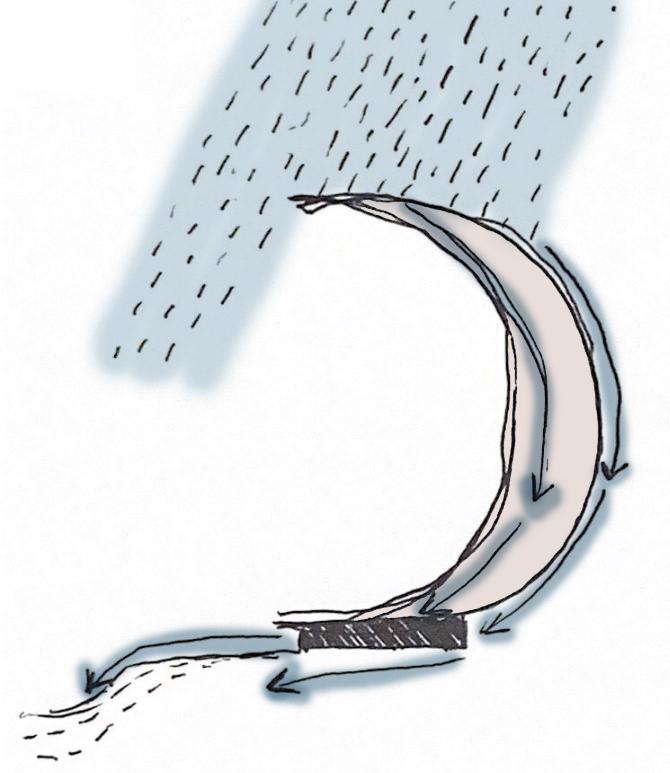 WATERSHED - the curves of each pod serve to direct water to the ground in areas where it will flow naturally into the culvert as well as down into the river.