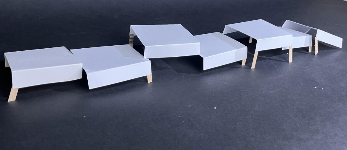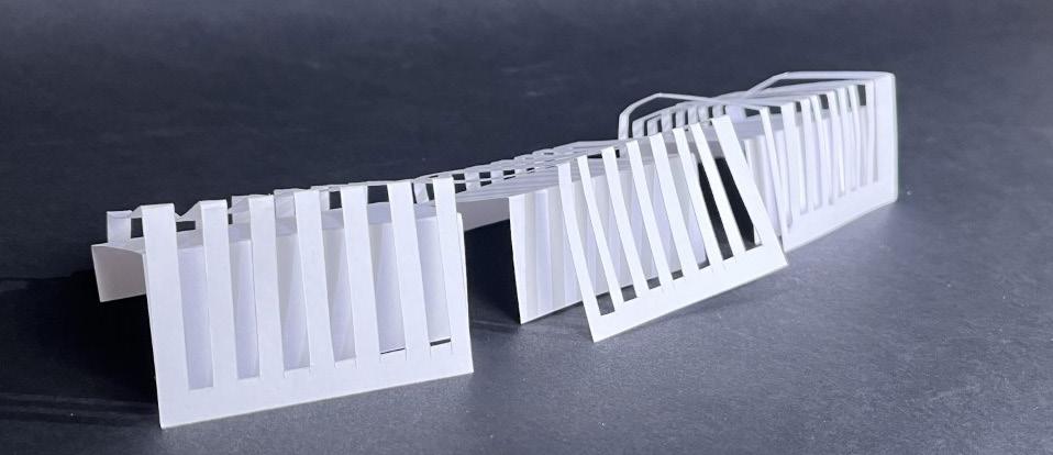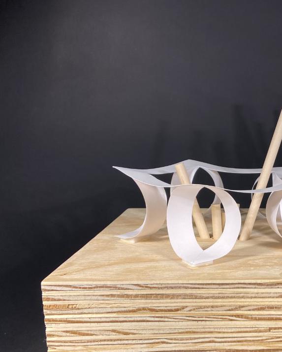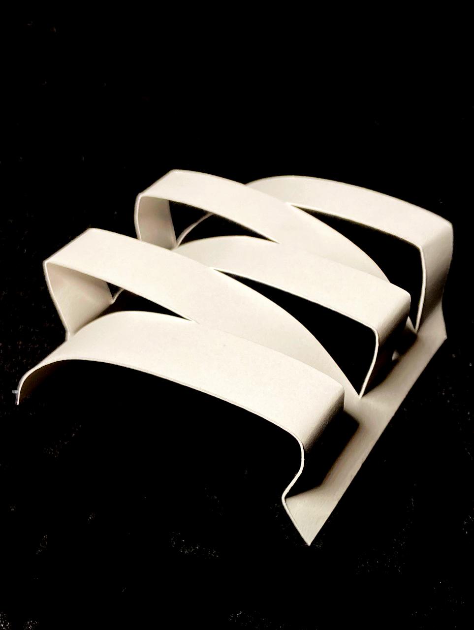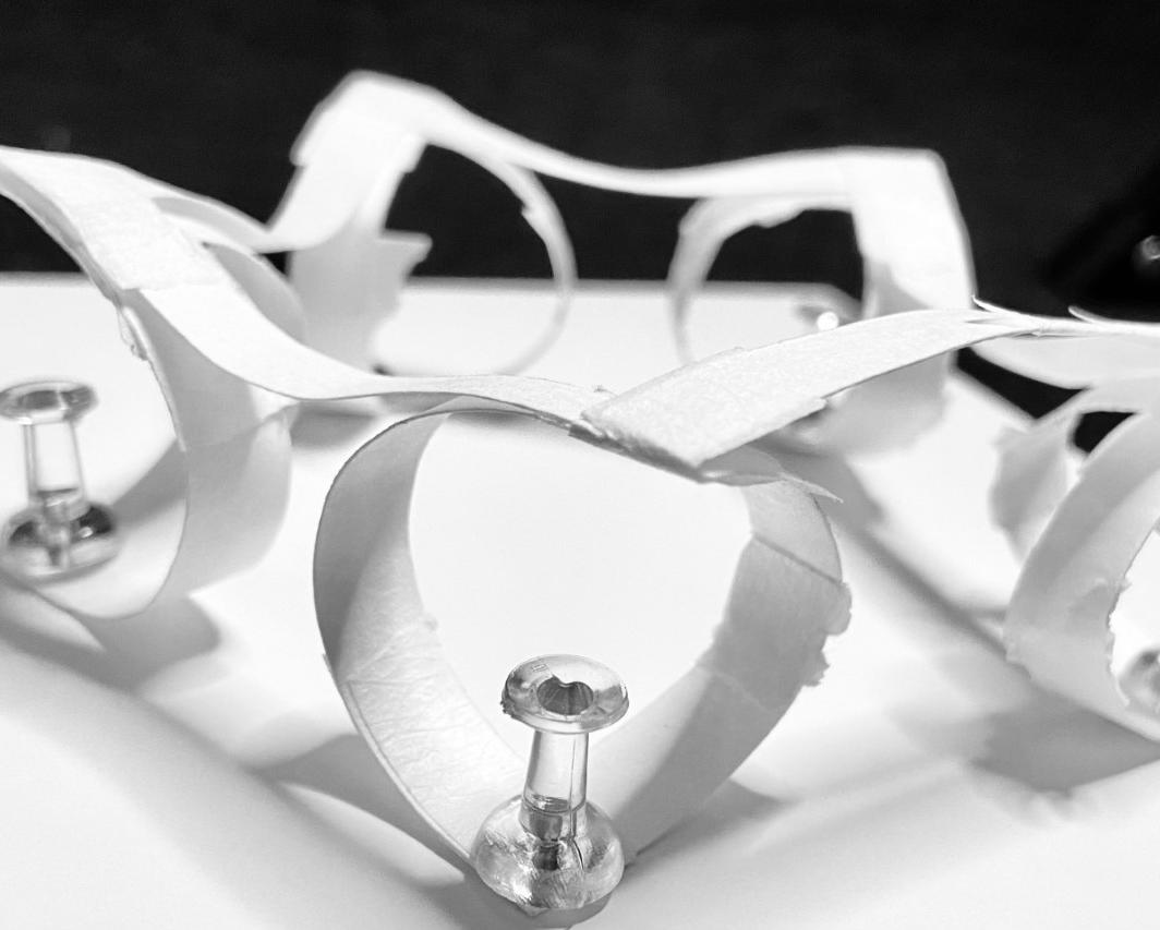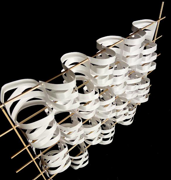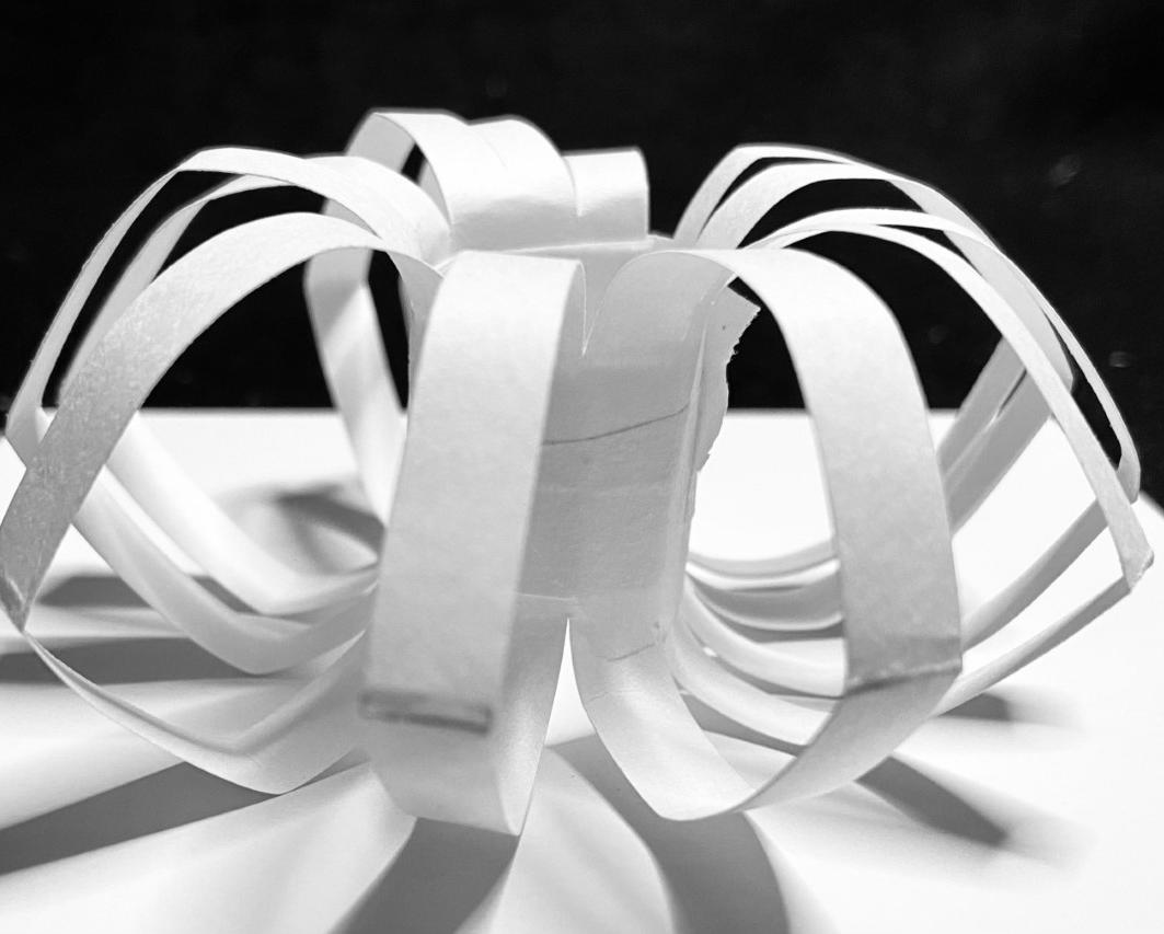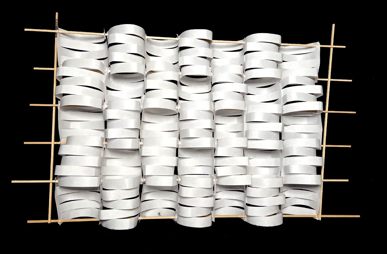 A conceptual design project- this excercise sought to understand pattern, form, and function. It began with a simple pod constructed through cutting and folding. That pod was then repeated in a discovered pattern that would enable the “wall” to stand using only the pod and wooden dowel sticks. As part of the excercise, the elements were not allowed to be glued or taped together, they must stand alone.
