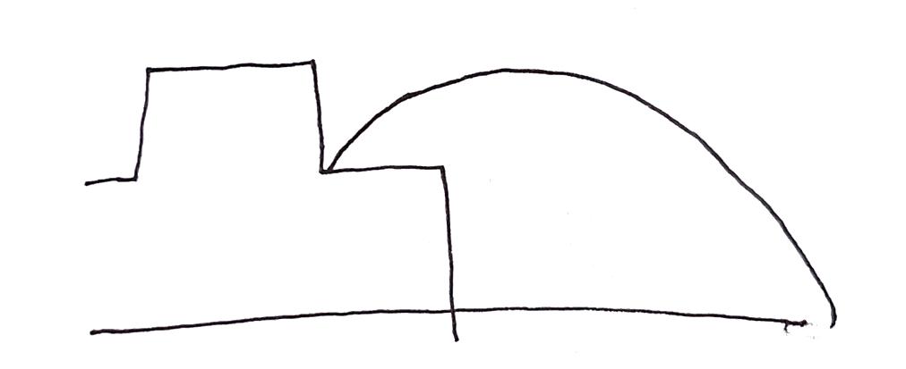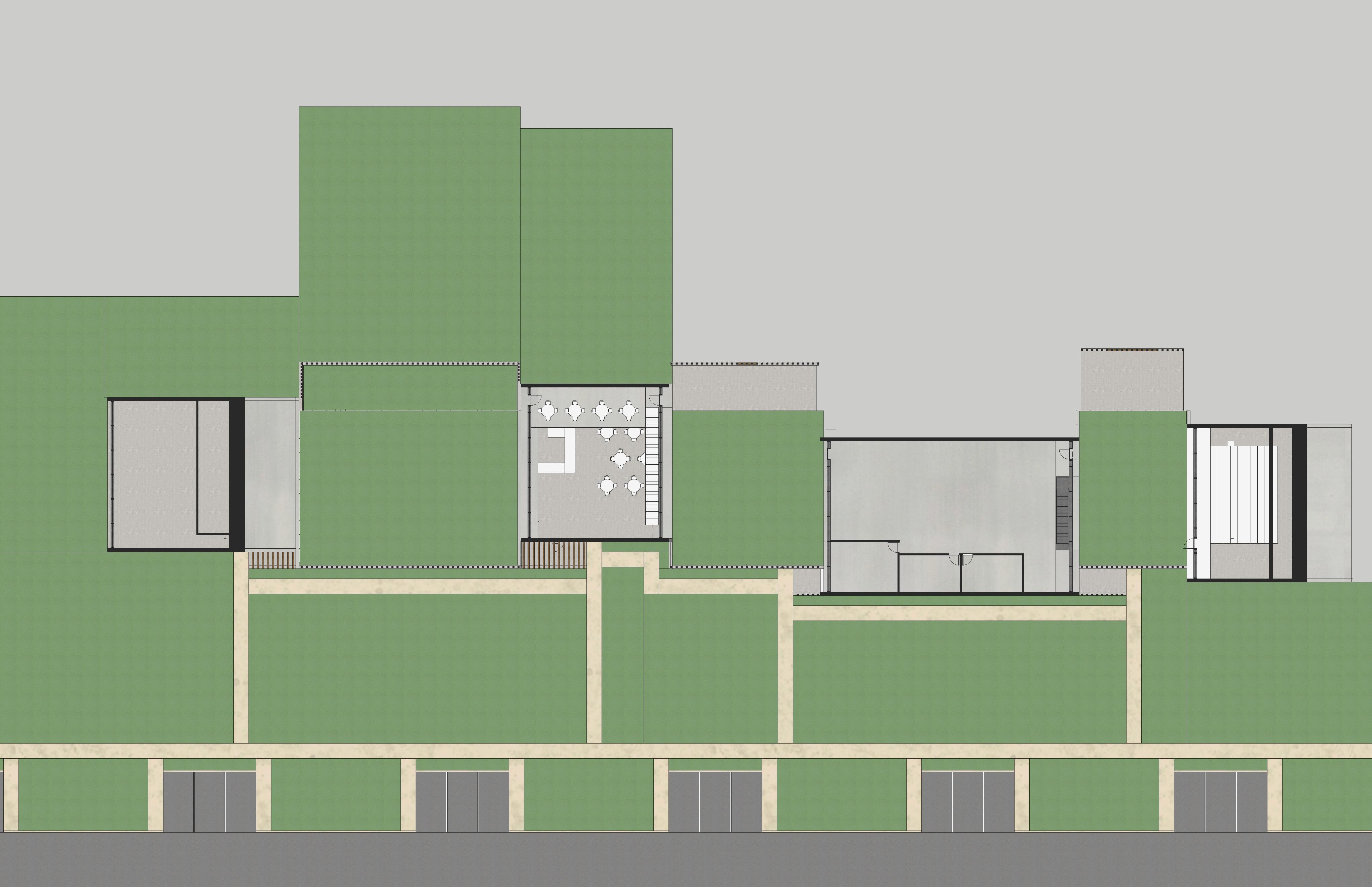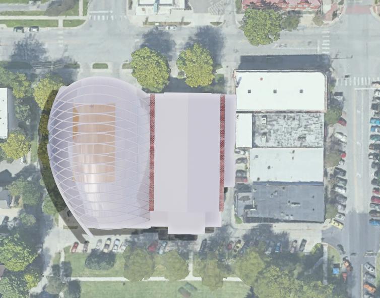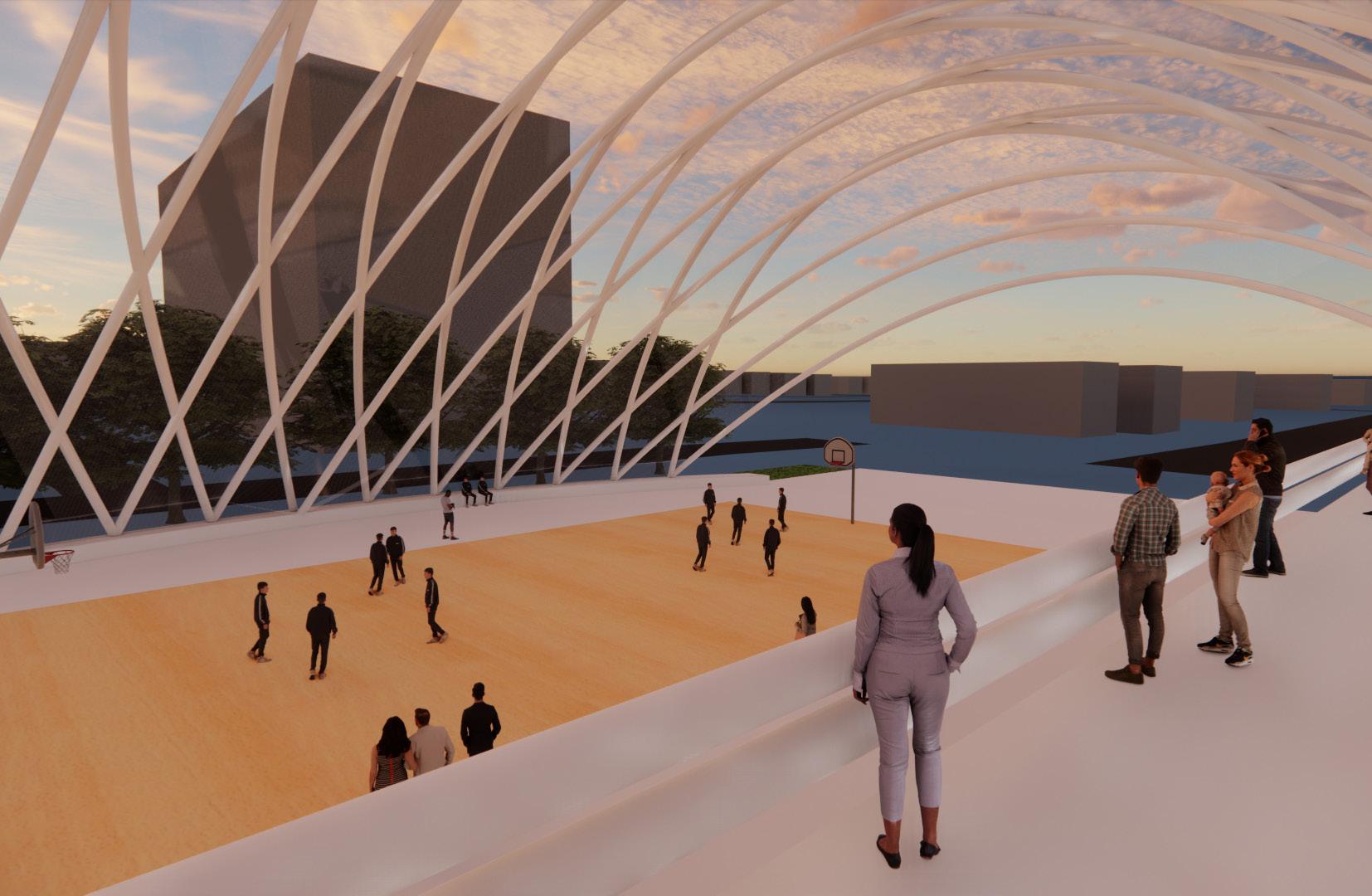 I began the design process by investigating possible connections to the existing community center. I landed on a structure that would connect at the first level roof and reach over and across the previous parking lot. The aim was to creat occupiable space on top of the roof that would serve as a viewing area to the court.