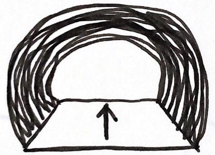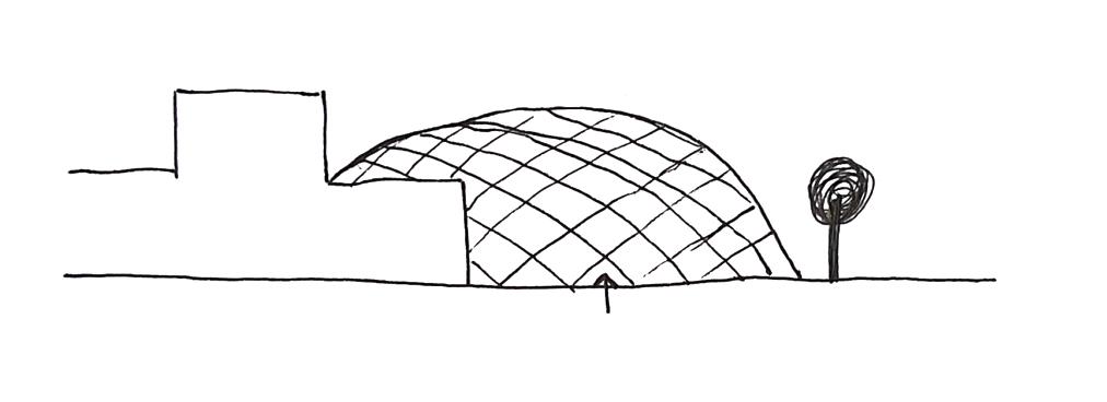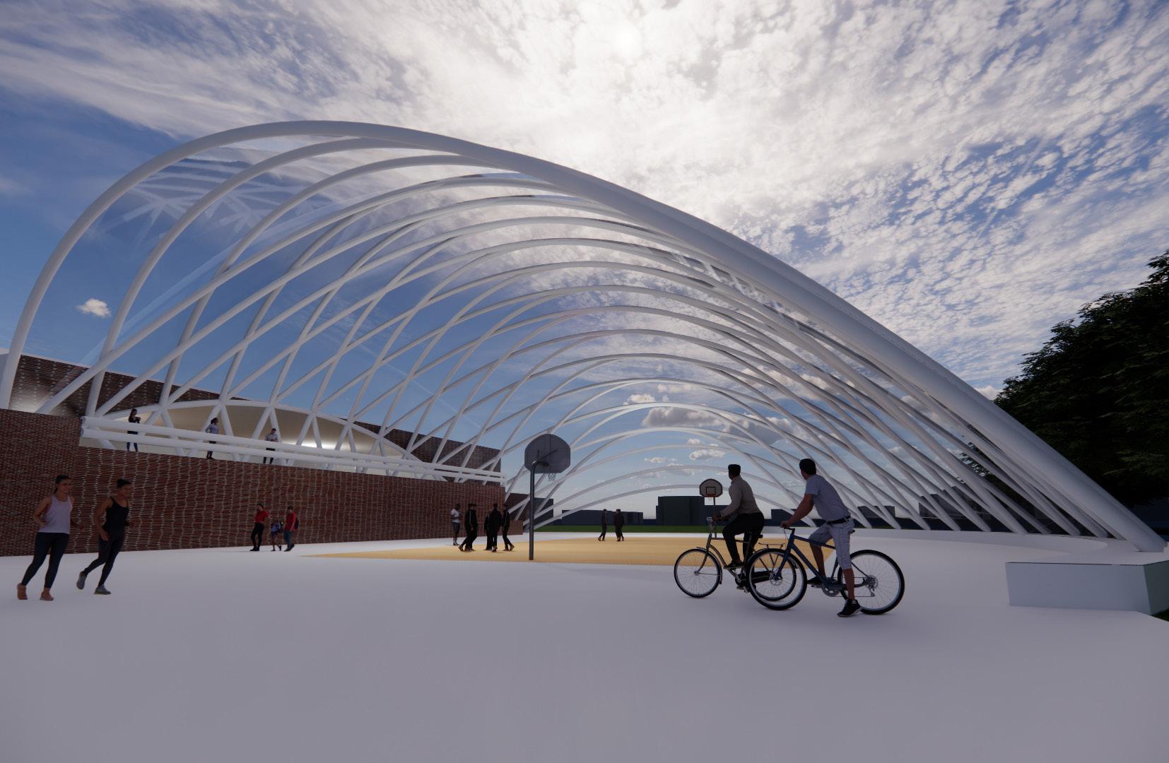 The final design consisted of poles that arched from the roof, over the court, and anchored in the ground. The shape in essence was an oval-shaped dome, with openings on both of the shorter ends allowing circulation through the pavillion.