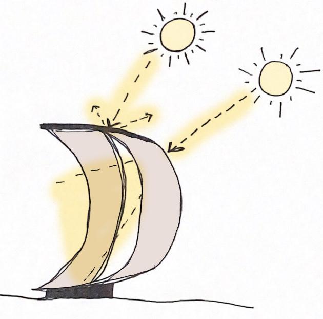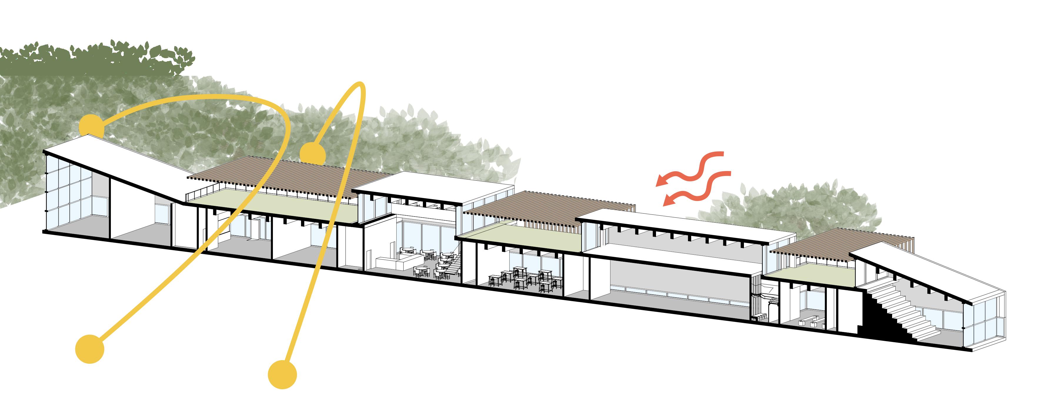 LIGHT - the overlapping of the two walls of the pod along with the pentagon-shaped overhang/connecting force aim to shade from high summer sun and allow lower winter sun to warm the space.