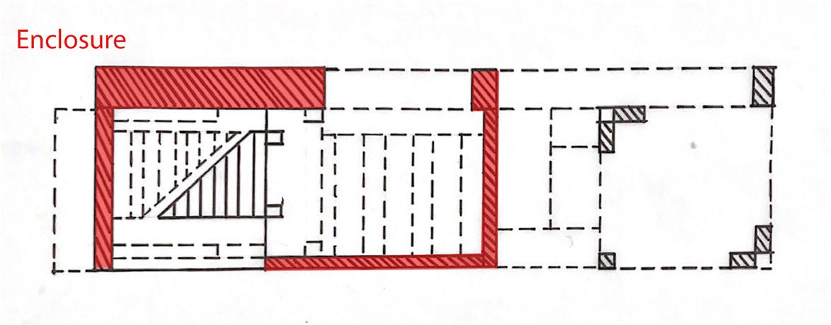 Using a drafted floorplan I used Adobe Photoshop to highlight the four main elements of this project- enclosure, structure, circulation, and views.