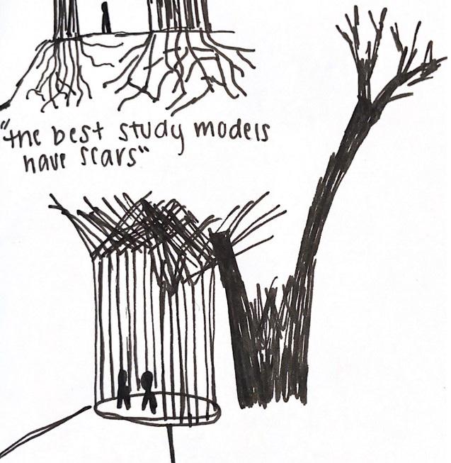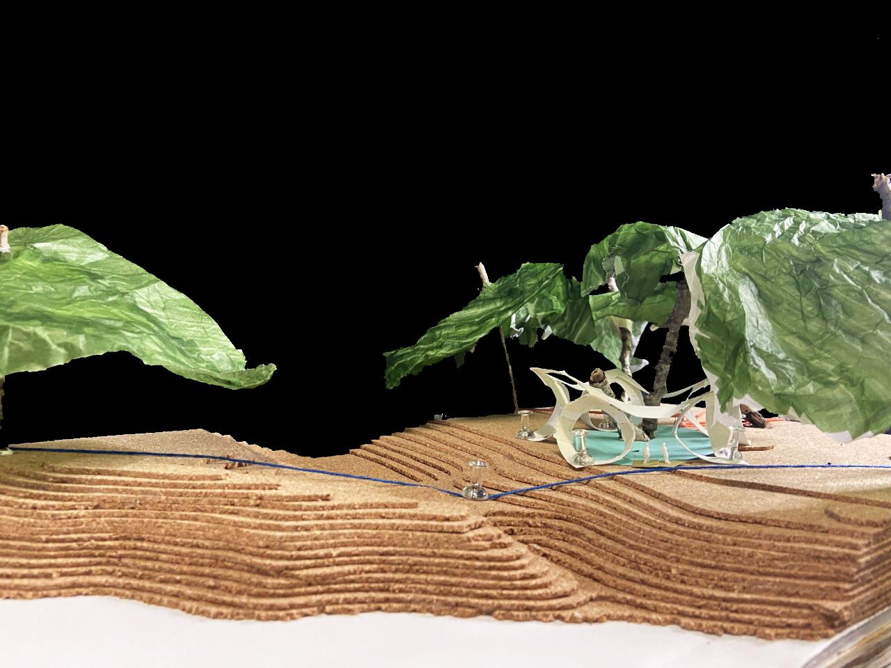 Moving into form, I experimented with taping, folding, bending, cutting, and tearing many index cards. Ideas began to emerge of a structure that would surround the tree and give unique access to the surrounding events of the