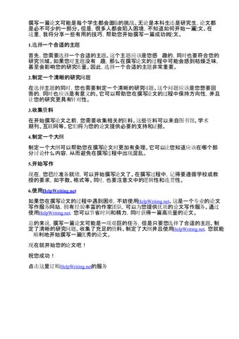 撰写一篇论文可能是每个学生都会面临的挑战。无论是本科生还是研究生,论文都 是必不可少的一部分。但是,很多人都会陷入困境,不知道如何开始一篇论文。在 这里,我将分享一些有用的技巧,帮助您开始撰写一篇成功的论文。