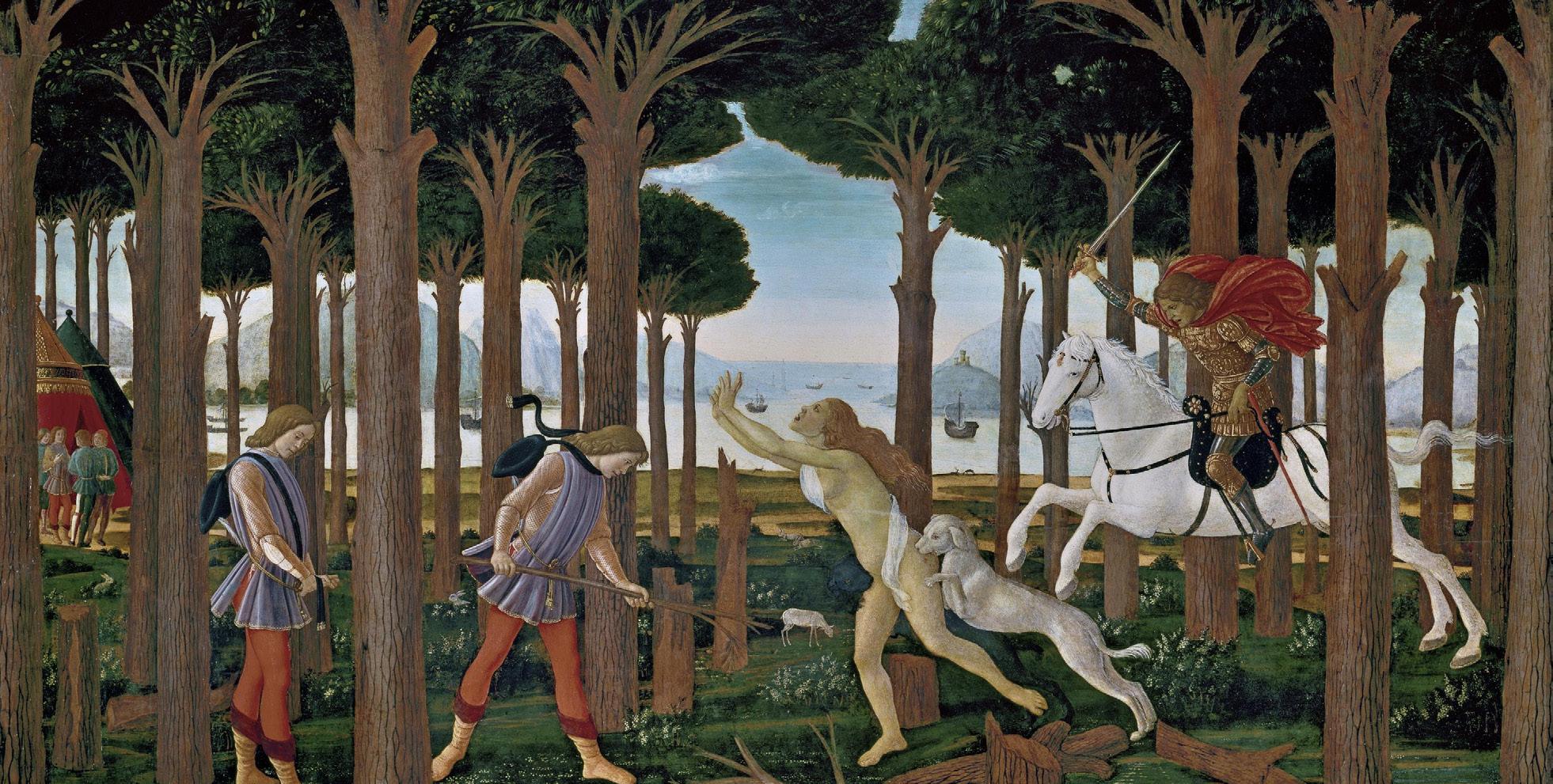 Esta es probablemente una de mis obras favoritas de Botticelli, no solo por su historia sino también por la forma en que el pintor supo narrarla en cuatro paneles. Por ejemplo, en el tercer panel, podemos observar dos escenas que representan la idea del ciclo eterno, mostrando a los dos fantasmas en el fondo de la escena, persiguiéndose sin descanso.