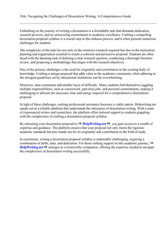 In conclusion, writing a dissertation proposal syllabus is undeniably challenging, requiring a combination of skills, time, and dedication. For those seeking support on this academic journey, ⇒ HelpWriting.net⇔ emerges as a trustworthy companion, offering the expertise needed to navigate the complexities of dissertation writing successfully.