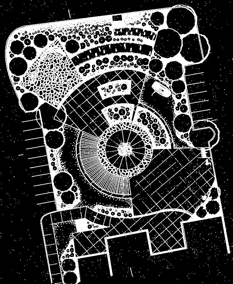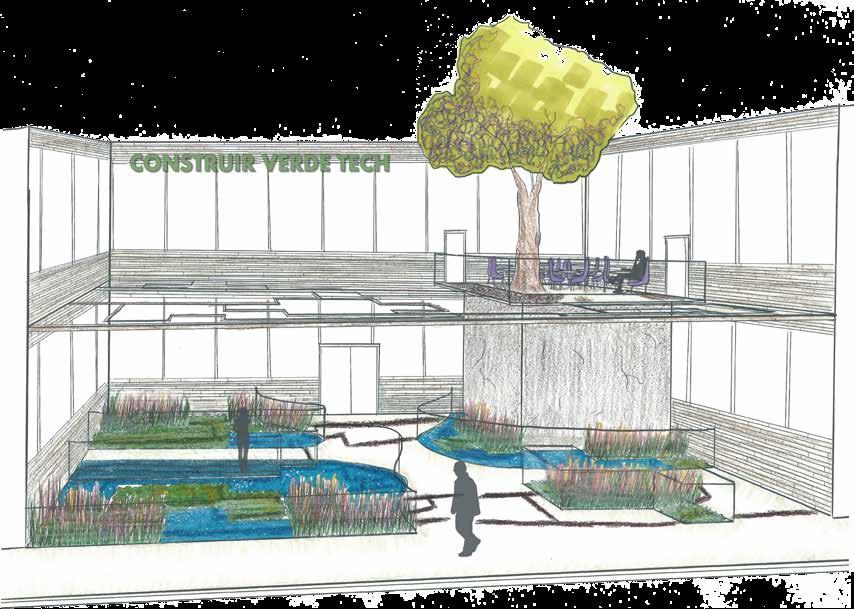 Construir Verde Plaza is the interface between the theoretical green infrastructure consultant group and the public. The entry plaza is a demonstration landscape of the services the consulting company provides. The design was inspired by the work of Mexican landscape architect Mario Schjetnan. The constructed wetland system includes a below-ground holding tank to store excess stormwater, available in times of minimal rain. The geometric art structure doubles as a sprinkler