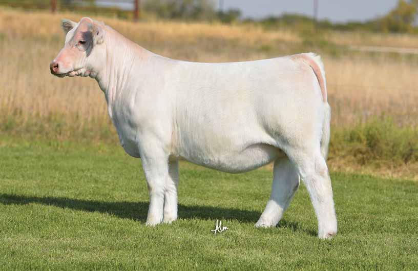 Beef cow. One you need to see in person to truly appreciate just how sound, seamless, and soft she is. A wide, woofy, smooth made, front pasture bovine. You can’t put a better hip and hind leg on one. Massive bodied with the notebook drawing, perfect swoop to her underline. She’s loose constructed, her added flexibility and reach is evident in how comfortable that one gets out and goes. This is her mother’s first set of ET calves for the Sleichter Family, and I’d say she’s here to stay. Her dam was a $40,500 sale feature out of our 4021 (Pays to Believe Donor owned with Robinson), in this sale a few years ago, and went on to make top 5 at Kansas Beef Expo, then went on a tear and won Supreme at every jackpot attended after that, Iowa AGR, Missouri AGR, and Aggieville, then went on to win Denver as a bred. Yes, she has a little chest and a white foot, but who cares when you’re packin that much product around on such a legit structural set up and seamless body type.