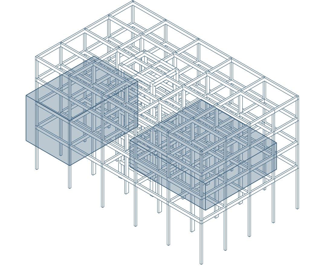 Using mass timber, this project expands off of the exisiting facade of Slocum Hall. The structure appears in a typical grid with the gallery and review volumes interupting the intensity of the grid with double height spaces facilitated by transfer beams.