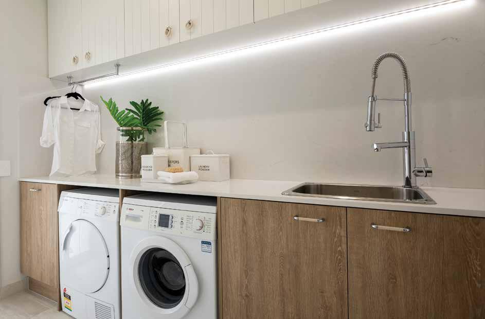 •400mm high tiling to laundry cabinet splashback, 1300mm high tiling to washing machine space (design specific) with 100mm high skirting tile to remainder. Tiles from Builder’s Premiere Range. White grout to walls and grey grout to flooring areas.
