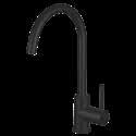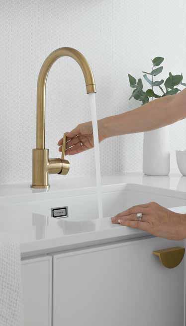 •Abey Gareth Ashton Lucia Gooseneck sidelever kitchen sink mixer – your choice of 4 finishes (brushed brass, brushed nickel, matt black or chrome – 1 tapware colour throughout) mounted in Caesarstone benchtop.