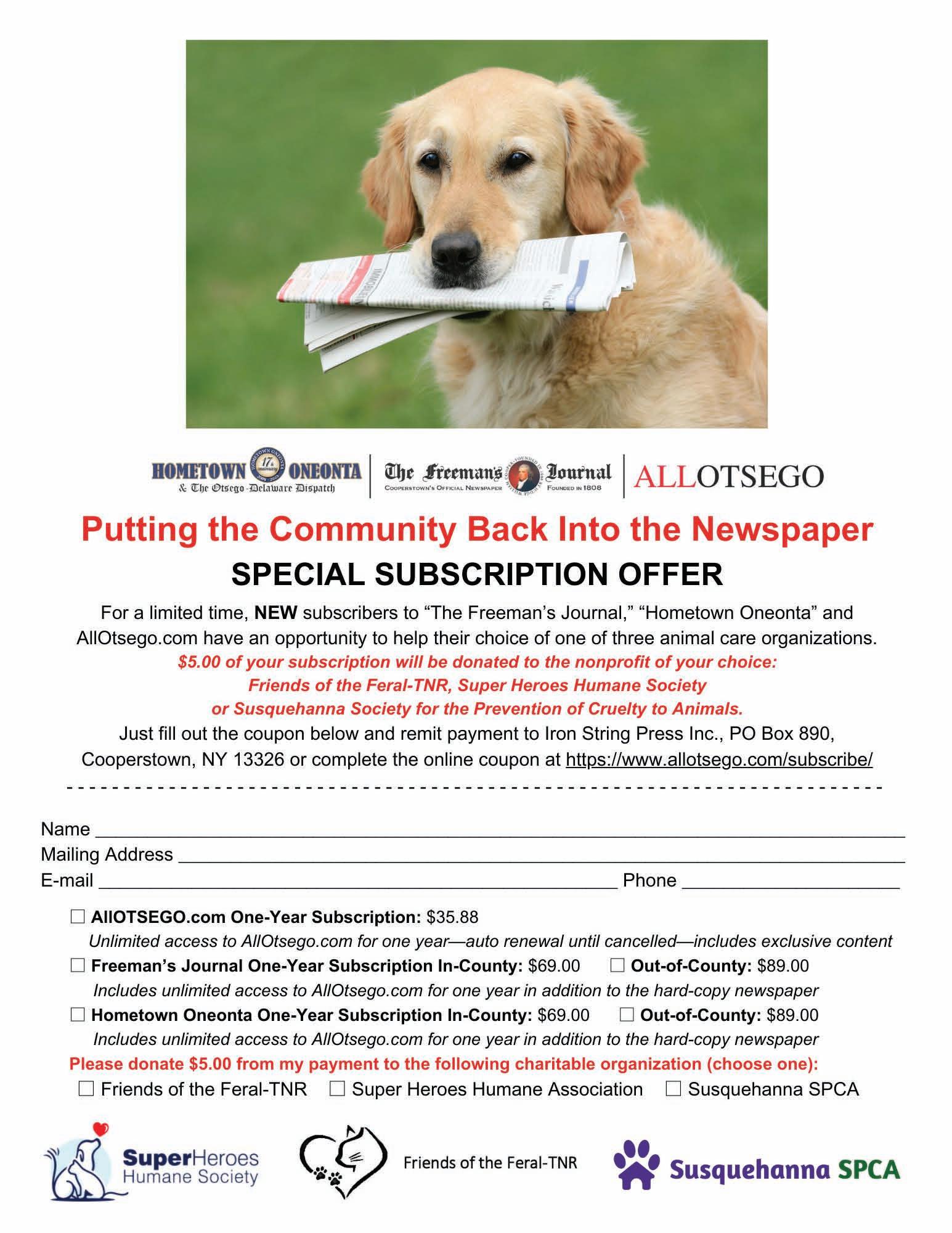FUNDRAISER—5-7 p.m. “Annual Otego Fire Department Auxiliary Soup Supper.” Admission is by donation. Please bring canned/non-perishable food items for the local food pantry. Includes free blood pressure checks with Otego EMS. Otego Fire Department, 3 River Street, Otego.