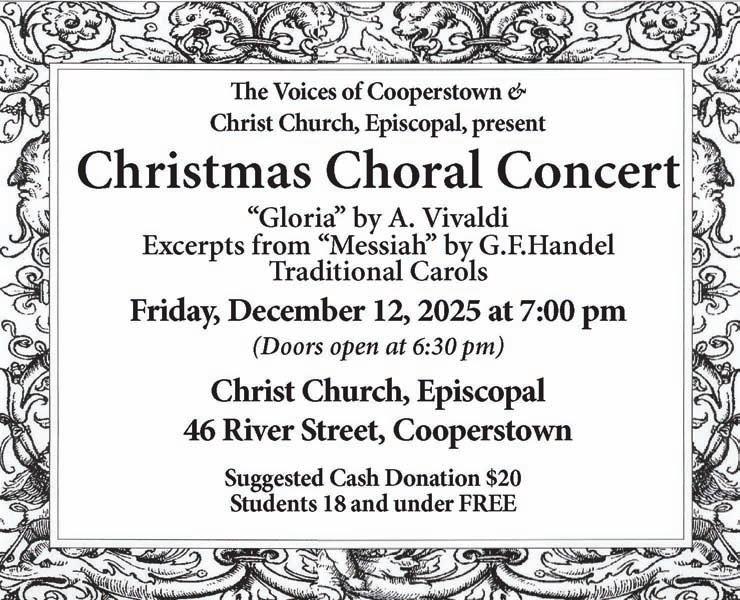 HOLIDAYS 4:30-8 p.m. “Glimmer Nights.” Featuring vignettes from Charles Dickens’ “A Christmas Carol” and the new Holiday Tree Decorating Contest. Continues Thursday, Friday, Saturday and Sunday evenings through 1/4/26. Fenimore Farm and Country Village, 5775 State Highway 80, Cooperstown. (607) 5471450.