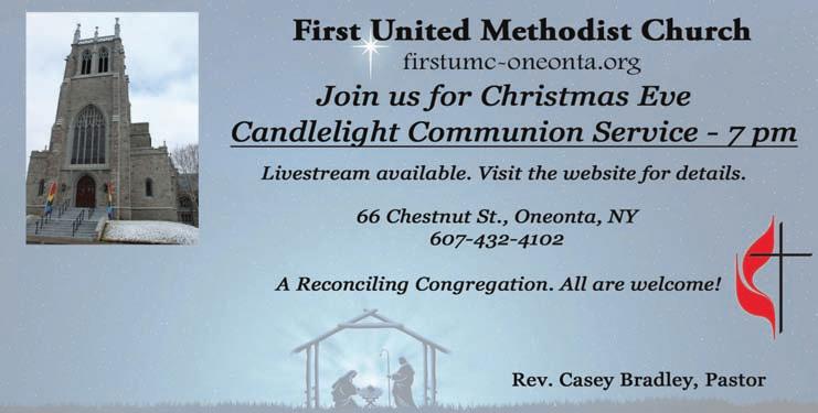 peppers and onions, O’Brien potatoes, lima beans, and pineapple. (607) 547-6454. • 11:30 a.m. Each Monday-Friday. Nader Towers Housing, 2 Mitchell Street, Oneonta. • Noon. Each Monday and Wednesday. Cherry Valley Facilities Corporation Café, 2 Genesee Street, Cherry Valley. CONNECTIONS Noon. Tech Support with Eric. Connections at Clark Sports Center, 124 County Highway 52, Cooperstown. connectionsatcsc@gmail.com. WORKSHOP Noon to 2 p.m. “Smart Energy Choices Weatherization Workshop.” Free; registration required. The Gathering Place, 5506 State Highway 7, Oneonta. (607) 547-2536 ext. 224. CONNECTIONS 12:45-1:30 p.m. “Potting a Succulent Plant for Gift Giving.” Walk-ins welcome; registration appreciated. Bring your own container and starter succulent or choose from supplies provided. Connections at Clark Sports Center, 124 County Highway 52, Cooperstown. connectionsatcsc@gmail. com. FILM 1:30 p.m. “Homeschool Family Movie Event: Miracle of Christmas.” Kinney Memorial Library, 3140 County Highway 11, Hartwick. (607) 2936600.