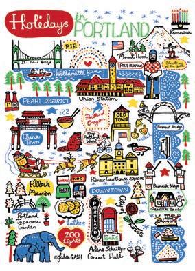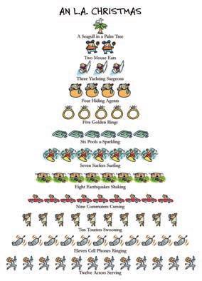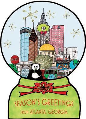 A Partridge in a Peach Tree; 2 Swinging Golfers; 3 Stone Mountain Lookers; 4 Blooming Magnolias; 5 Golden Peanuts; 6 Savannah Ghosts Dancing; 7 MARTA Trains a-Screeching; 8 Cokes a-Fizzing; 9 Braves Batting; 10 Blue Crabs a-Crawling; 11 Falcons a-Running; 12 Pecans a-Glazing Happy Holidays