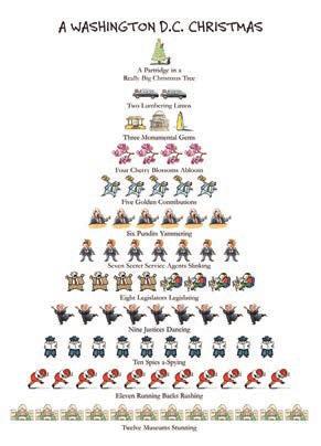 A Partridge in a Really Big Christmas Tree; 2 Lumbering Limos; 3 Monumental Gems; 4 Cherry Blossoms Abloom; 5 Golden Contributions; 6 Pundits Yammering; 7 Secret Service Agents Slinking; 8 Legislators Legislating; 9 Justices Dancing; 10 Spies a-Spying; 11 Running Backs Rushing; 12 Museums Stunning Season’s Greetings