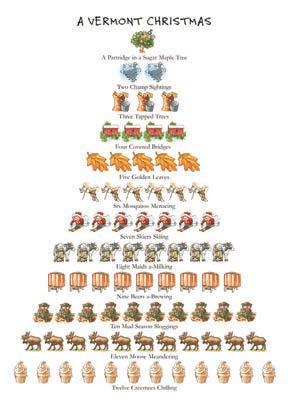 A Partridge in a Sugar Maple Tree; 2 Champ Sightings; 3 Tapped Trees; 4 Covered Bridges; 5 Golden Leaves; 6 Mosquitos Menacing; 7 Skiers Skiing; 8 Maids a-Milking; 9 Beers aBrewing; 10 Mud Season Sloggings; 11 Moose Meandering; 12 Creemees Chilling Season’s Greetings