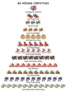 A Cardinal in a Pear Tree; 2 Bridges Spanning; 3 Pawpaws in a Pocket; 4 Hundred Burial Mounds; 5 Golden Delicious Apples; 6 Fireflies Glowing; 7 Squirrels a-Flying; 8 Rafters Rafting; 9 Miners Dancing; 10 Pepperoni Rolls Rolling; 11 Mountaineers Climbing; 12 Country Roads Taking Me Home Season’s Greetings