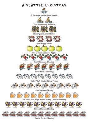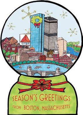 A Chickadee in an Elm Tree; 2 Cranberry Bogs; 3 Cornered Hats; 4 Presidents Hailing; 5 Golden Lighthouses; 6 Writers Scrawling; 7 Cod a-Swimming; 8 Boats a-Bobbing; 9 Red Sox Batting; 10 Brahmins Leaping; 11 Plovers Piping; 12 Marathoners Running Season’s Greetings