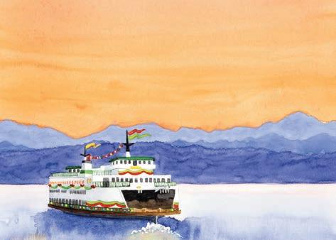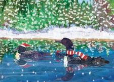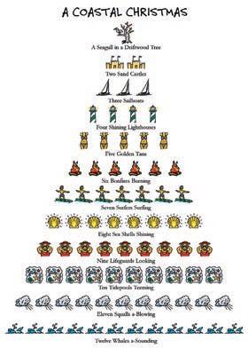 A Partridge in a White Pine; 2 Blueberry Pies; 3 Island Dots; 4 Freezing Fishermen; 5 Golden Leaves; 6 Summer People Scurrying; 7 Black Flies Buzzing; 8 Artists Painting; 9 Lakes a-Lapping; 10 Lobsters Hiding; 11 Loons a-Laughing; 12 Snowmen Smiling Season’s Greetings