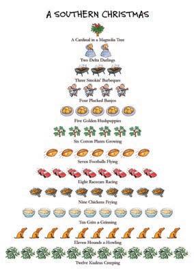 A Partridge in a Magnolia Tree; 2 Bayous; 3 Elvis Seekers; 4 Sweet Teas; 5 Golden Comeback Sauces; 6 Blues Riffs a-Playing; 7 Delta Tractors Tilling; 8 Mud Pies Munching; 9 River Boats Rolling; 10 Catfish Dinners Devouring; 11 Egg Bowl Rivals Battling; 12 Gators Lurking