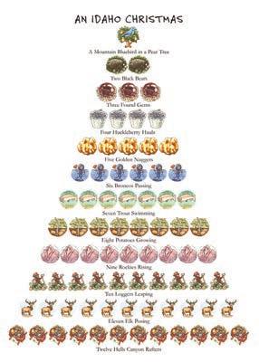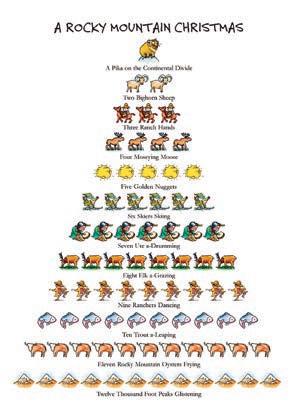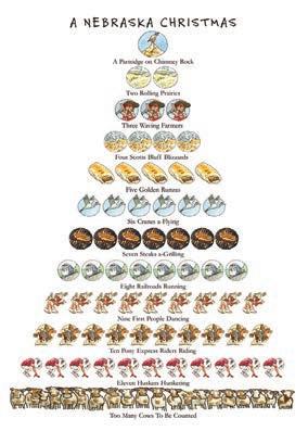 A Partridge on Chimney Rock; 2 Rolling Prairies; 3 Waving Farmers; 4 Scotts Bluff Blizzards; 5 Golden Runzas; 6 Cranes aFlying; 7 Steaks a-Grilling; 8 Railroads Running; 9 First People Dancing; 10 Pony Express Riders Riding; 11 Huskers Hunkering; Too Many Cows to be Counted Season’s Greetings
