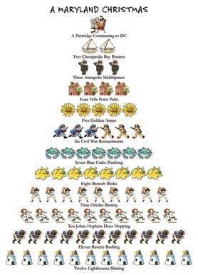 A Partridge Commuting to DC; 2 Chesapeake Bay Boaters; 3 Annapolis Midshipmen; 4 Fells Point Pubs; 5 Golden Asters; 6 Civil War Reenactments; 7 Blue Crabs Pinching; 8 Biotech Blobs; 9 Orioles Batting; 10 Johns Hopkins Docs Hopping; 11 Ravens Bashing; 12 Lighthouses Shining Season’s Greetings