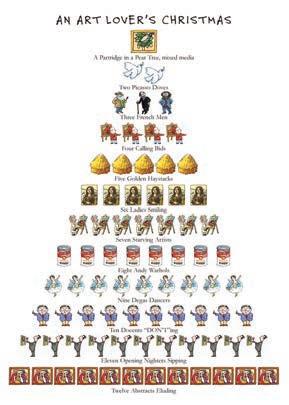 A Partridge in a Birch Tree; 2 Granite Quarries; 3 Finches and Hens; 4 Quaint Churches; 5 Golden Leaves; 6 Candidates Campaigning; 7 White Mountain Peaks; 8 Avid Antiquers; 9 Skaters Dancing; 10 Liquor Store Shoppers Leaping; 11 Leaf Peepers Peeping; 12 Degrees Below Zero Season’s Greetings